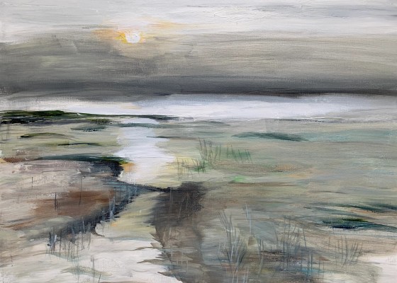 Am Abend hatte es geschneit. Die Wintersonne zeigt sich am Mittag tief über dem dunstigen Wolkenband. Der Priel, der sich